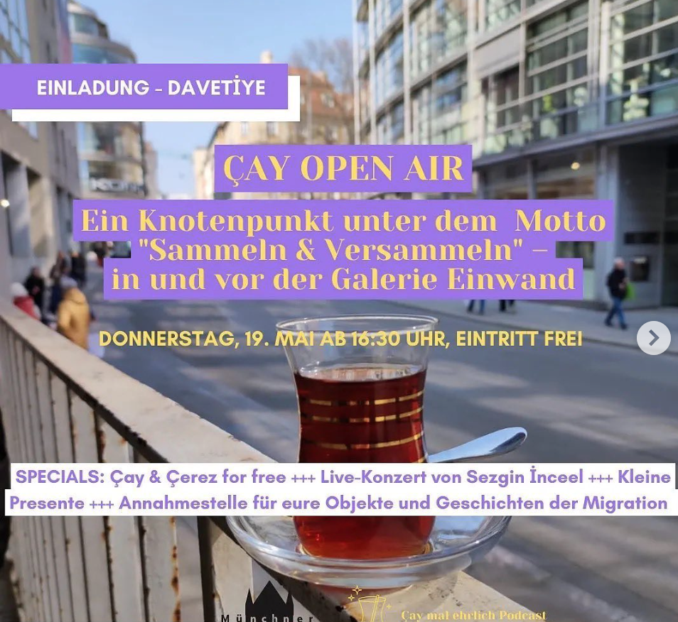 Wir wollen uns aber nicht nur versammeln, sondern auch Objekte und Geschichten der Migration sammeln: Wer sich in die Münchner Stadtgeschichte einschreiben möchte und Teil zukünftiger Ausstellungen zur Geschichte Münchens werden will, hat hier die Gelegenheit mit seinem geschichtsträchigen Objekt zum Çay Open Air zu kommen. Tunay Önder und Ursula Eymold (Sammlung Stadtkultur/Migrationsforschung) nehmen eure Geschichten und die dazugehörigen Objekte feierlich in Empfang und ebnen den Weg ins kollektive Gedächtnis der Stadt.