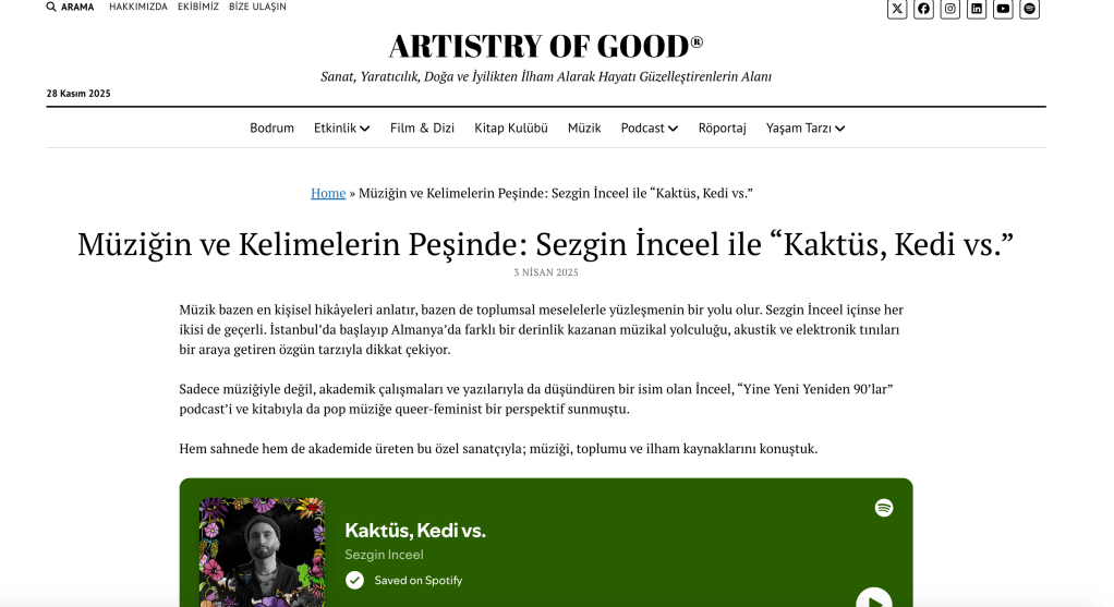 Thank you to Artistry of Good for this wonderful interview: https://artistryofgood.com/muzigin-ve-kelimelerin-pesinde-sezgin-inceel-ile-kaktus-kedi-vs/