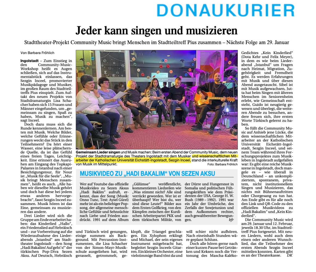 Jeder kann singen und musizieren/Donau Kurier Posted bySezgin Inceel22 January 2026Posted inGenel, Music, News, TeachingTags:community music, Music, music education Thank you, DonauKurier! Click to access pressespiegel-kw4di.pdf Bunu paylaş: Share on X (Opens in new window) X Share on Facebook (Opens in new window) Facebook Share on LinkedIn (Opens in new window) LinkedIn Email a link to a friend (Opens in new window) Email Share on Pinterest (Opens in new window) Pinterest Like Loading... Related